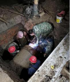 該段水泥管屬于主城區(qū)老舊管網(wǎng),管道周圍環(huán)境復(fù)雜,布有國防光纜、天然氣管道等重要設(shè)施,不能動(dòng)用大型機(jī)械,只能通過人工及簡易工具開挖。時(shí)間緊,任務(wù)重,為爭取搶修時(shí)間,搶修人員一邊現(xiàn)場制訂維修方案,一邊聯(lián)系準(zhǔn)備各種配件和維修材料。為將對(duì)用戶的影響降至最小范圍,水廠實(shí)行減壓供水,待開挖和搶修材料一切準(zhǔn)備就緒后,搶修人員實(shí)行帶水作業(yè),先給套管預(yù)留一個(gè)DN50鋼管作為導(dǎo)流口,待水泥頭子徹底凝固后再關(guān)閉導(dǎo)流口。封堵水泥頭子時(shí),噴涌而出的水流濕透了搶修人員的衣服,速干水泥灼傷了他們的皮膚,但他們沒有一絲退縮,仍爭分奪秒地在水坑中忙碌著搶修工作。