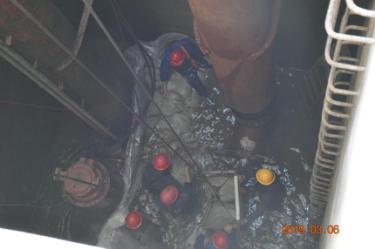 水廠機修人員下到12米沉水井內(nèi)的漏水點,詳細檢查后發(fā)現(xiàn)2號取水泵底座共6個固定螺絲,2個已斷裂,3個已松動,導致2號取水泵運行時底座不穩(wěn),嚴重影響供水安全,機修人員立即向公司領導匯報,制定了維修方案。