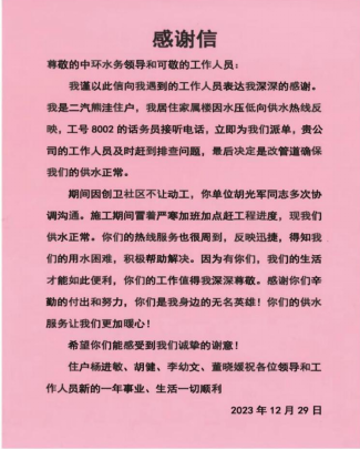 近日,襄陽中環(huán)水務(wù)有限公司樊城管網(wǎng)分公司收到一封熱情洋溢的感謝信,信中表達(dá)著對(duì)樊城管網(wǎng)分公司工作人員主動(dòng)作為、及時(shí)解決用戶用水難題的感謝、贊揚(yáng)和認(rèn)可。